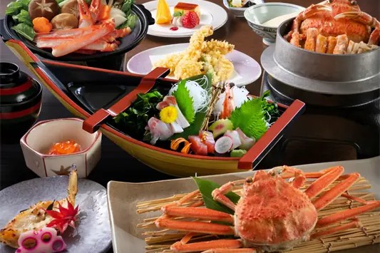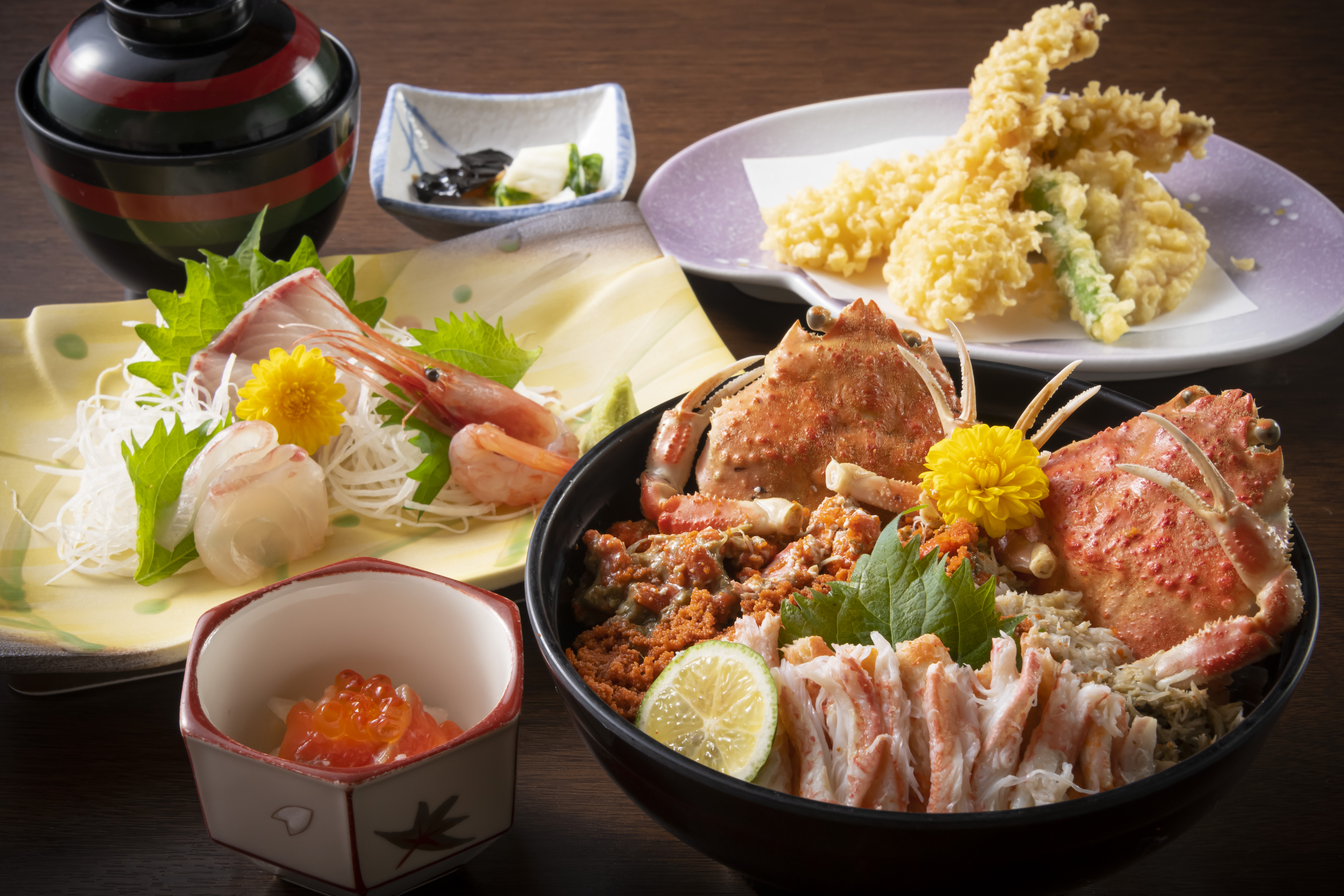 タグ付き越前蟹ゆでor蟹刺し/せいこ身だし(年内)/蟹すき鍋/蟹天婦羅/せいこ蟹釜飯/造り3種/吸物/香物/デザート※せいこ身だしは年明けからせいこ蟹グラタンに変更になります