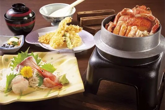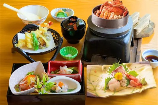 タグ付き越前蟹 ゆで蟹/せいこ身だし(年内)/蟹すき鍋/蟹天婦羅/せいこ蟹釜飯/造り3種/吸物/香物/デザート※せいこ身だしは年明けからせいこ蟹グラタンに変更になります