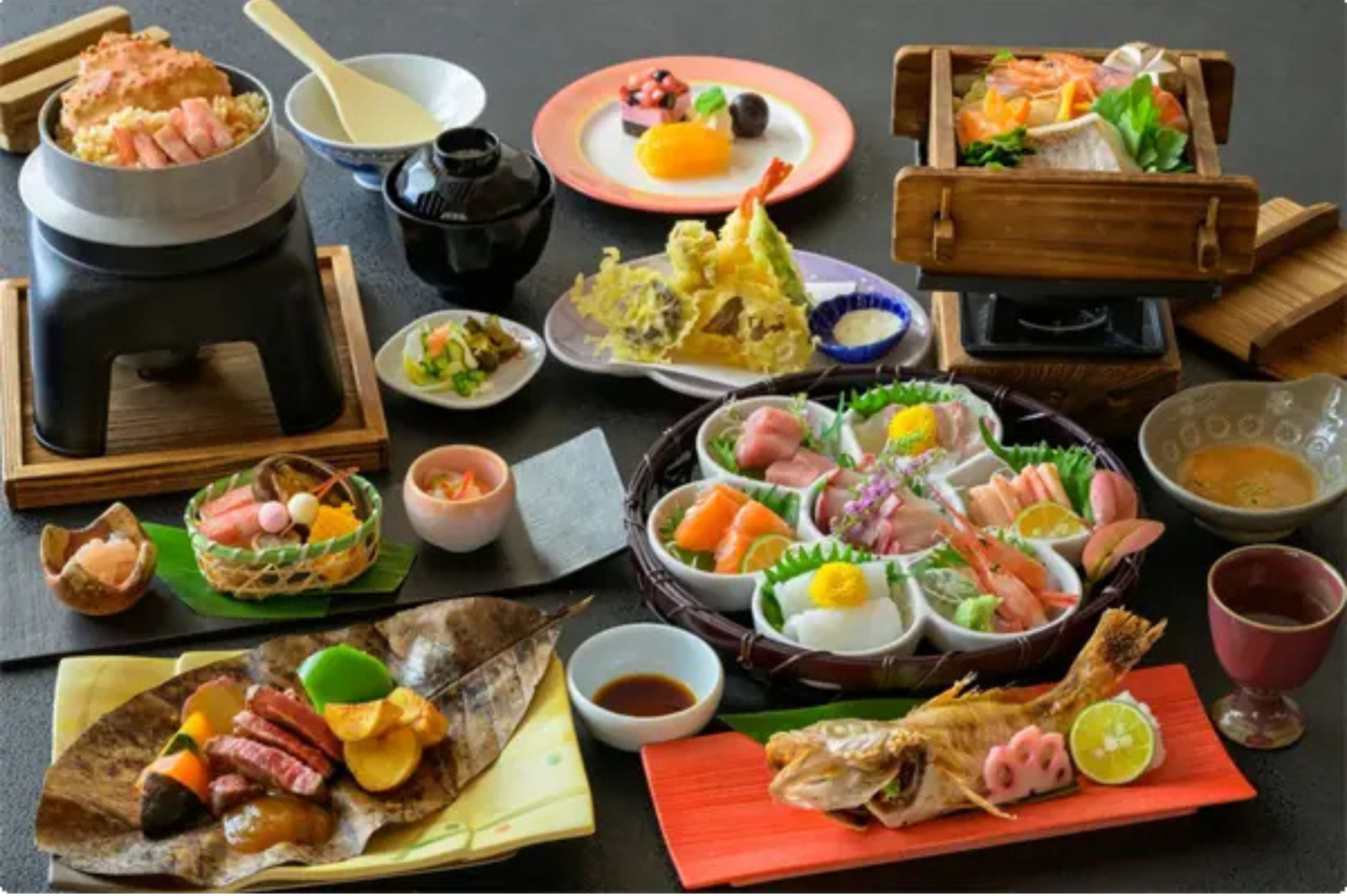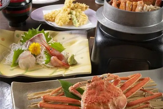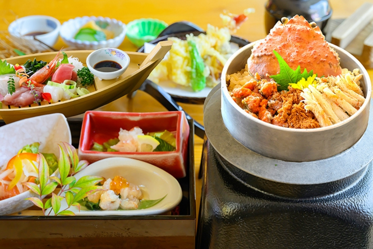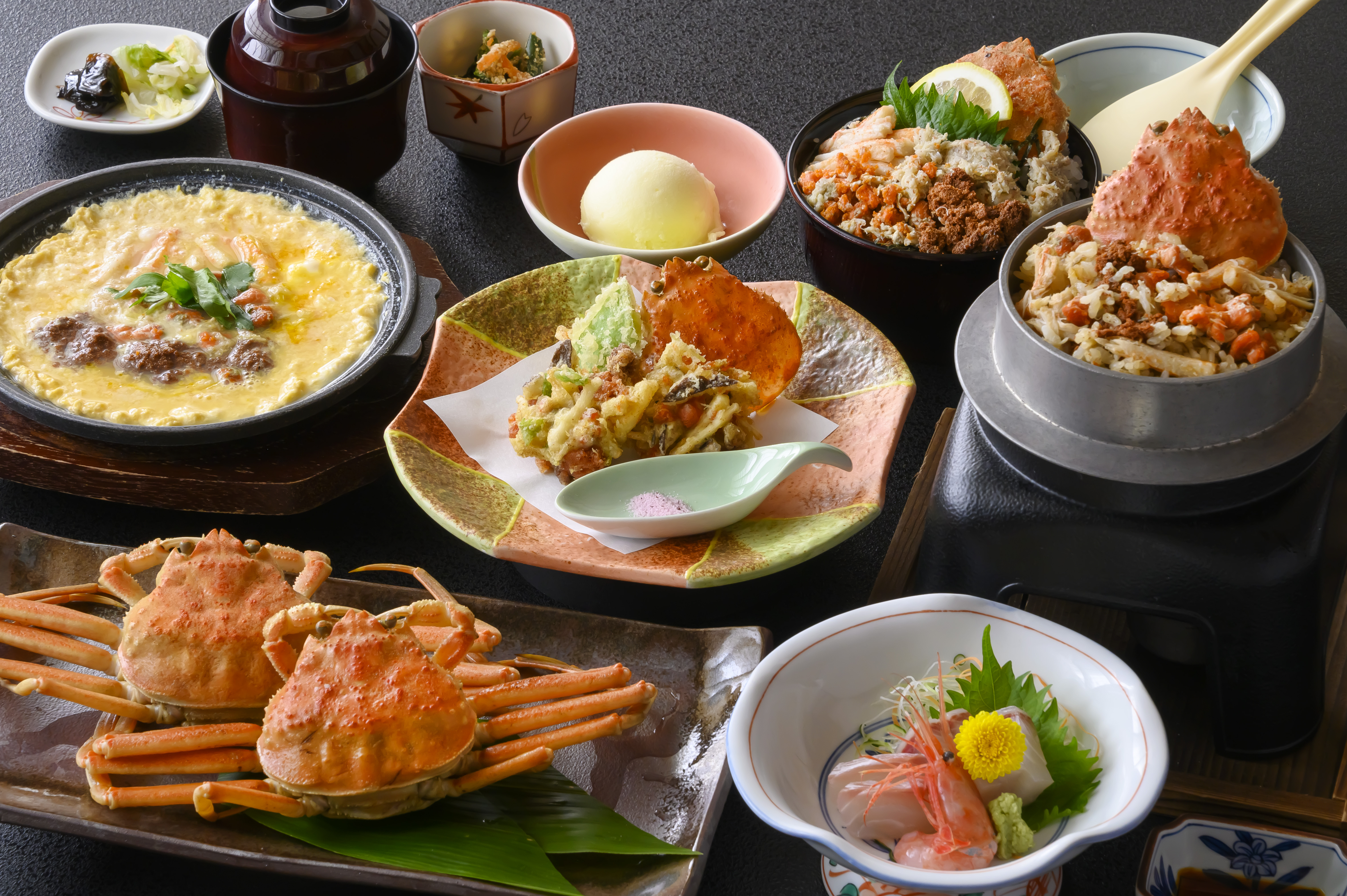 タグ付き越前蟹ゆでor蟹刺し/せいこ身だし/蟹すき鍋/蟹天婦羅/せいこ蟹釜飯/小鉢/造り3種/味噌汁/香物/デザート