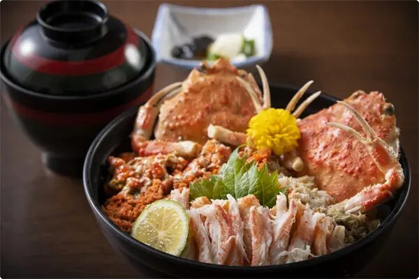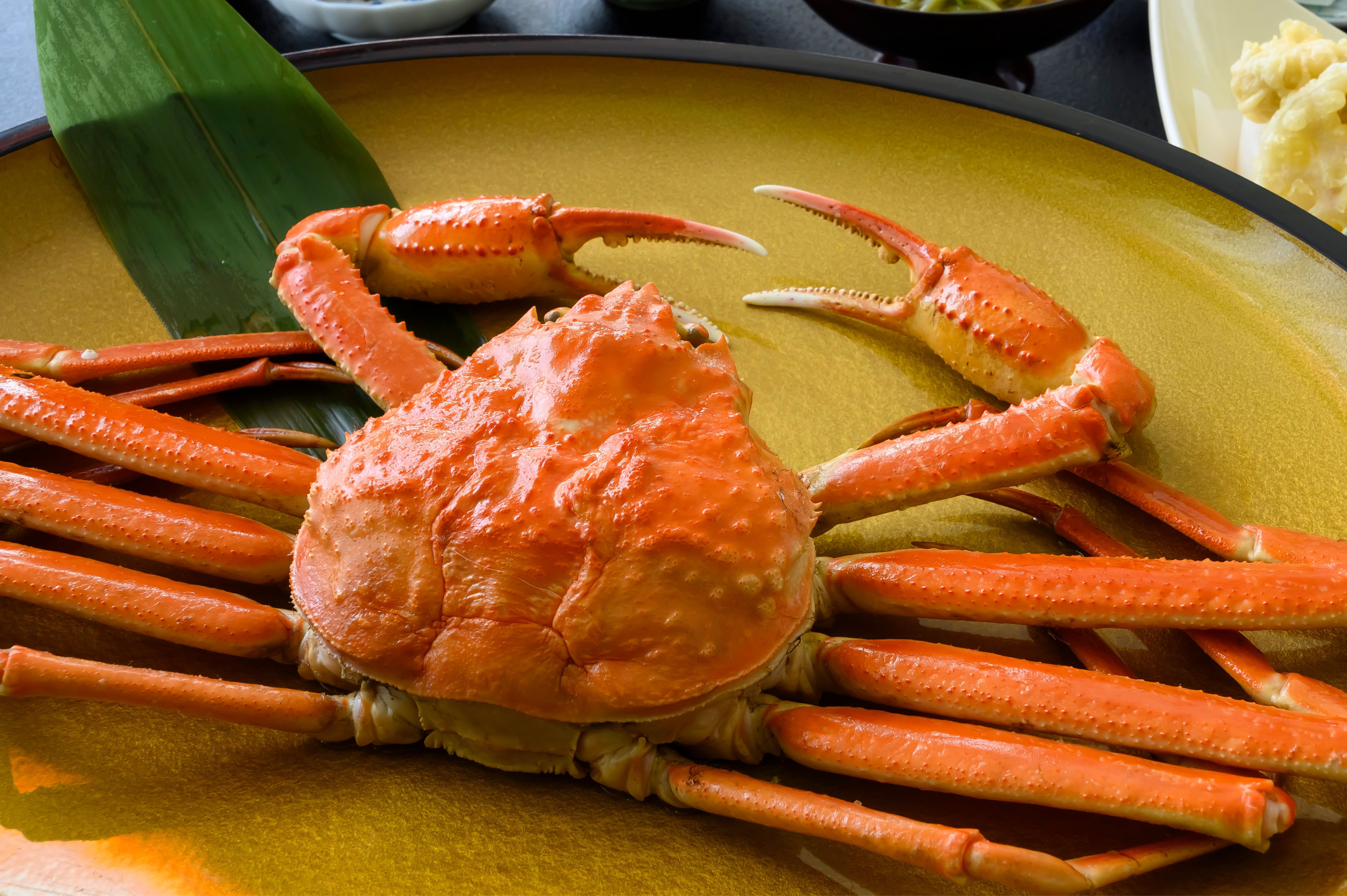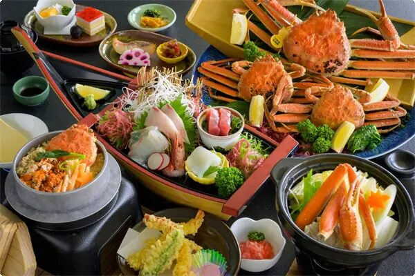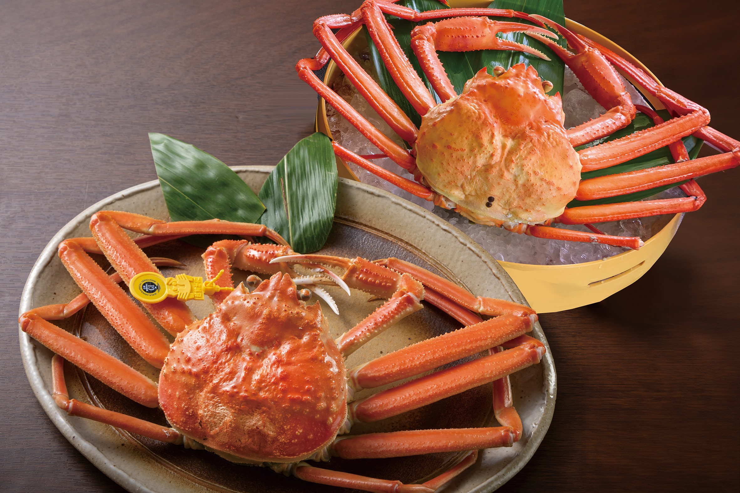 タグ付き越前蟹 ゆで蟹/蟹刺し/せいこ蟹身出し(年明けから紅ずわい半身に変更)/焼きしゃぶ/蟹天婦羅/せいこ蟹釜飯/汁物/香物/デザート